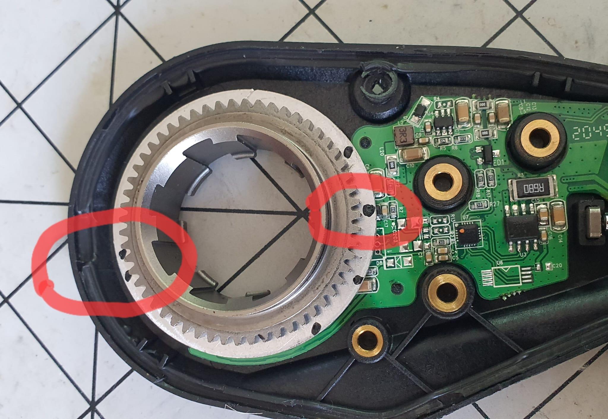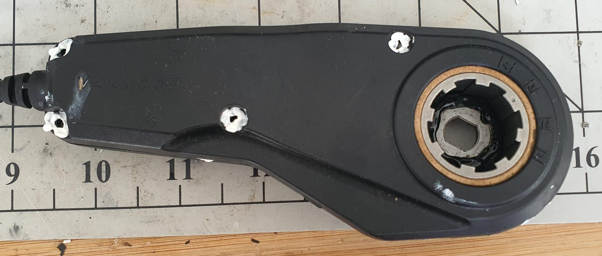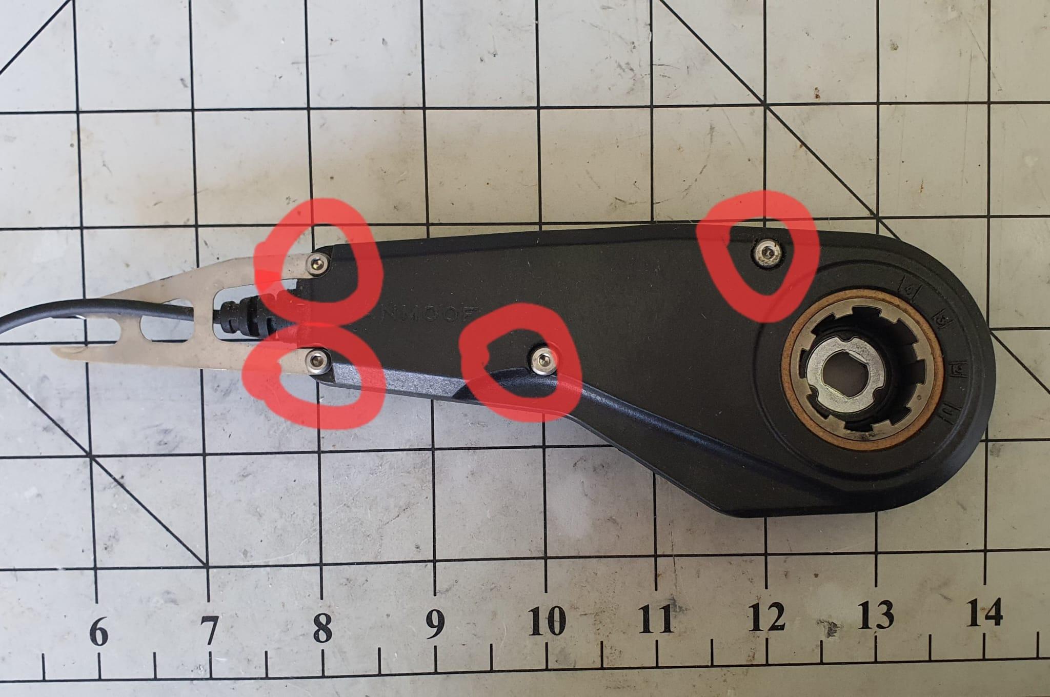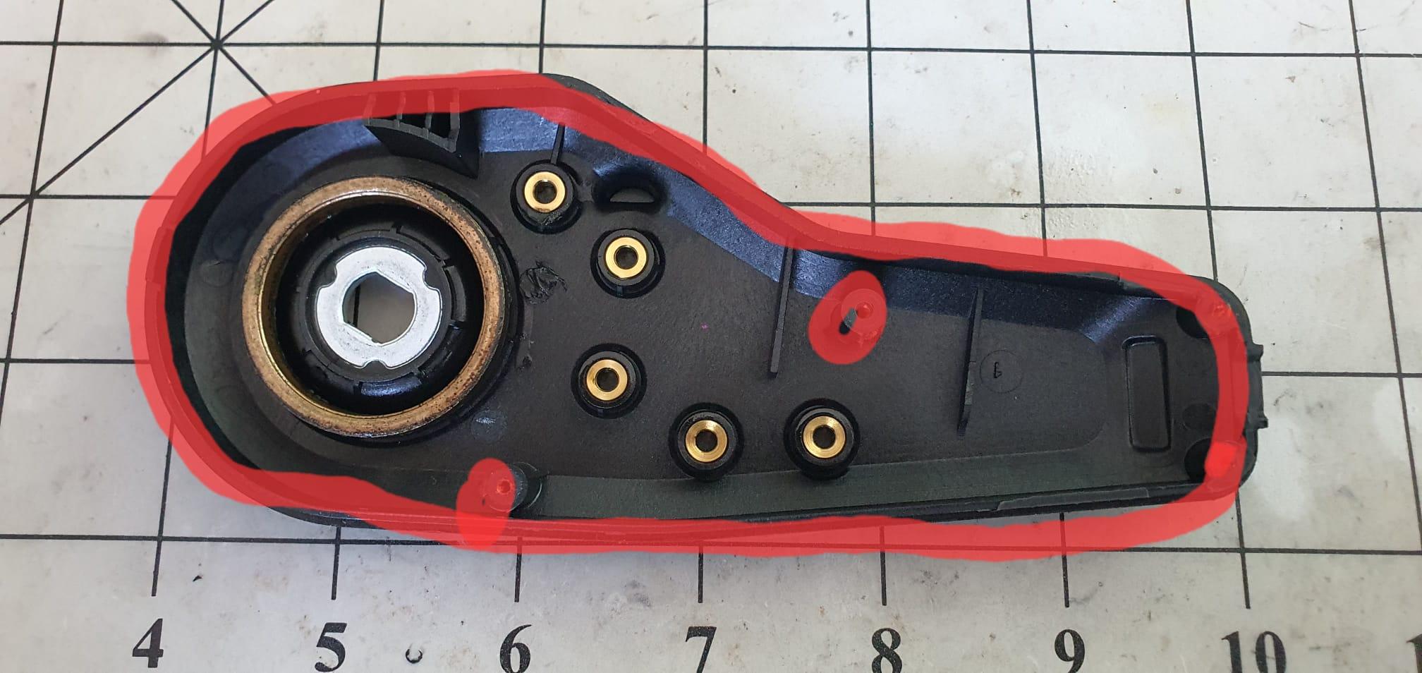 - apply the new gasket, it's white in the picture, don't miss the screw holes and close the eshifter / appliquer le nouveau joint, en blanc sur cette image, ne pas oublier les trous de vis et refermer le boitier